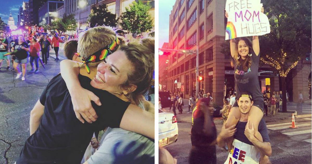 “My beloved little church went downtown to the #AustinPrideParade and gave out Free Mom Hugs, Free Dad Hugs, Free Grana Hugs, and Free Pastor Hugs like it was our paying jobs. And when I say hugs, I mean THE KIND A MAMA GIVES HER BELOVED KID.